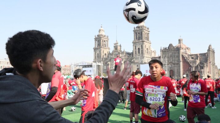 Zócalo Capitalino (Plaza De La Constitución), Ciudad De México, 16 de marzo de 2026.- La Ciudad de México obtuvo oficialmente un Récord Guinness por realizar la clase de fútbol más grande del mundo, con la participación confirmada de 9,500 personas que durante 35 minutos continuos ejecutaron ejercicios sobre un césped artificial instalado en la plancha del Zócalo capitalino. El evento, encabezado por la jefa de Gobierno, Clara Brugada, y que contó con la presencia de exfutbolistas y la titular de la Comisión Nacional de Cultura Física y Deporte (Conade), Rommel Pacheco, se enmarca en la cuenta regresiva para la Copa del Mundo de 2026.