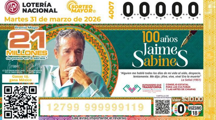 Como parte central de los festejos, la Lotería Nacional dedicará el Sorteo Mayor No. 4007 al escritor chiapaneco, poniendo en circulación un billete conmemorativo que reconoce su legado literario. Esta iniciativa busca honrar la trayectoria de Sabines, quien nació en Tuxtla Gutiérrez en 1926 y es considerado uno de los poetas más influyentes del siglo XX en México por su lenguaje cercano a la cotidianeidad y su capacidad para conectar emocionalmente con los lectores.