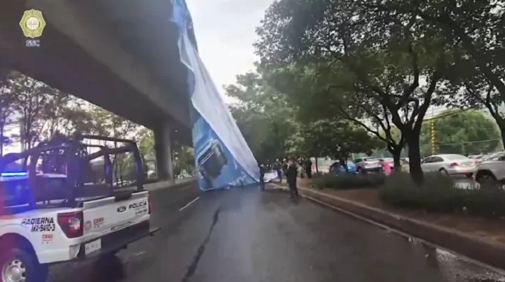 Ciudad de Mexico, 18 de marzo de 2026.- Fuertes vientos asociados a lluvias intensas derribaron un espectacular de grandes dimensiones sobre el Periférico Sur a la altura de las colonias Jardines del Pedregal y Fuentes del Pedregal durante la tarde del martes, lo que obligó a cortes viales y la intervención de cuerpos de emergencia. El incidente ocurrió aproximadamente a las 15:20 horas cuando la lona publicitaria, ubicada en un edificio en construcción, se desprendió por los efectos meteorológicos que incluyeron precipitaciones de hasta 29 milímetros pronosticadas por autoridades.