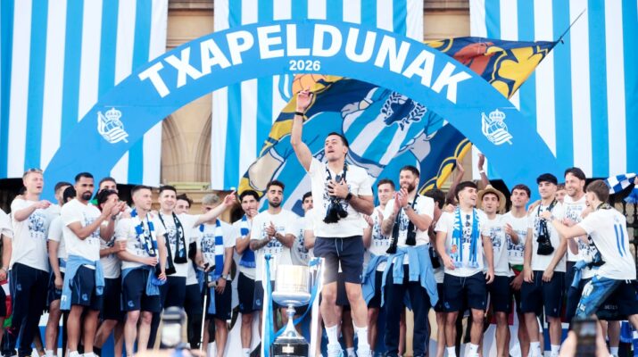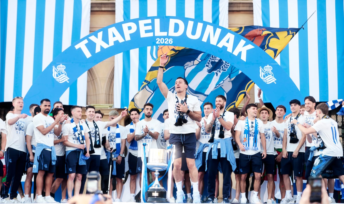San Sebastián, 21 de abril de 2026.- La Real Sociedad dedicó este lunes la Copa del Rey que ganó el sábado a su afición, durante una celebración multitudinaria en San Sebastián. La comitiva del equipo llegó en autobuses descapotables al Alderdi Eder hacia las siete menos cuarto, donde miles de aficionados aguardaban la llegada de los campeones.