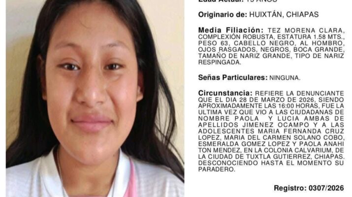 Las personas reportadas son: María Fernanda Cruz López, de 16 años, originaria de Huixtla; Lucía Jiménez Ocampo, de 20 años, de Tzimol; Paola Jiménez Ocampo, de 22 años, también de Tzimol; María del Carmen Solano Cobo, de 16 años, de Venustiano Carranza; Esmeralda Gómez López, de 14 años, de Salto de Agua; y Paola Anahí Ton Méndez, de 15 años, originaria de Huixtla.